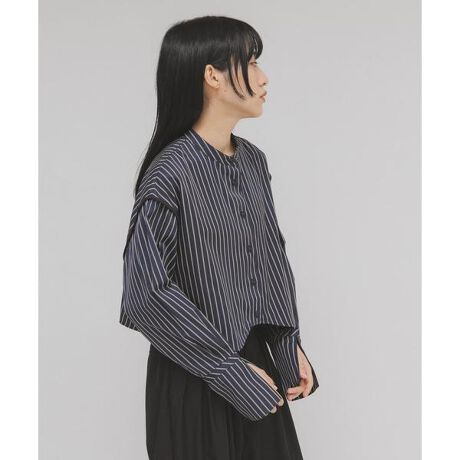 ヘムカットデザインが特徴的なクロップド丈のストライプ柄シャツ。配色パイピング仕様が表情感をプラスし、スリットが入ったカフスもポイントです。全体的にモードに仕上げているので、ベーシックボトムに合わせるだけで簡単に着映えます。