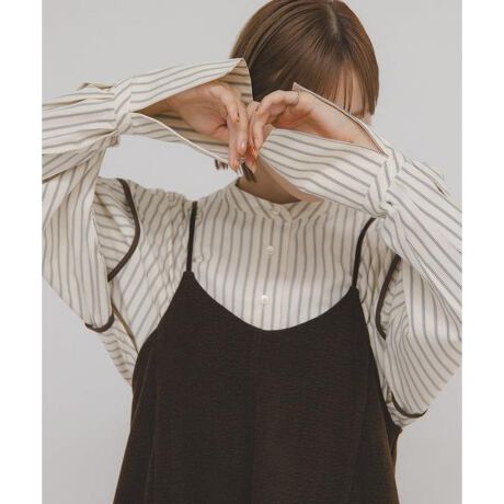 ヘムカットデザインが特徴的なクロップド丈のストライプ柄シャツ。配色パイピング仕様が表情感をプラスし、スリットが入ったカフスもポイントです。全体的にモードに仕上げているので、ベーシックボトムに合わせるだけで簡単に着映えます。