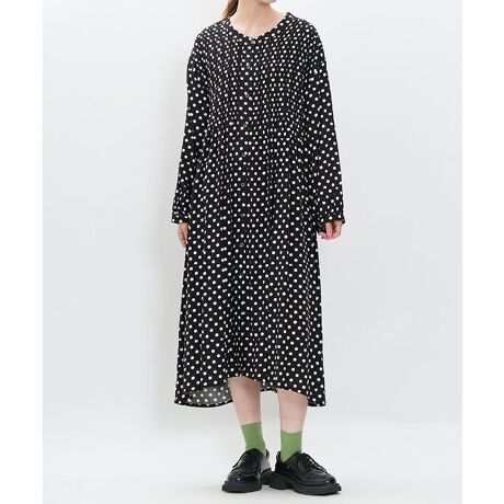 [型番:VG0127]◆ 総ドット柄が目を惹くワンピース ◆胸元には細やかなピンタックを贅沢に施し、シンプルながら技ありの一枚に仕上げました。Vネックですっきりとした印象を与え、柄ものでも軽やかに着こなせます。前開き仕様なので、ワンピースとしてはもちろん、羽織りとしても活躍。華やかさと着回し力を兼ね備えた優秀アイテムです。model:H166