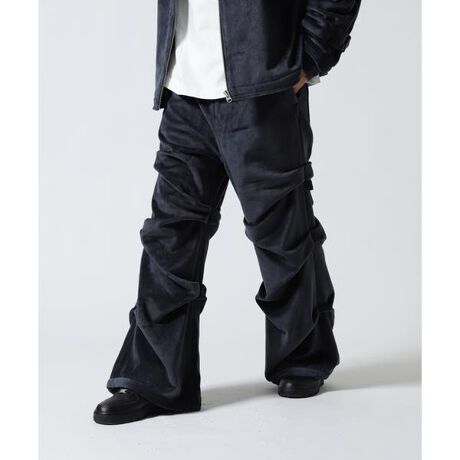 トレンド感と個性を兼ね備えた一着。柔らかく上品な光沢感を放つベルベット素材を使用し、履き心地も抜群。特徴的なドレープ加工と立体的なギャザーデザインが、シンプルながらも存在感のあるシルエットを演出します。