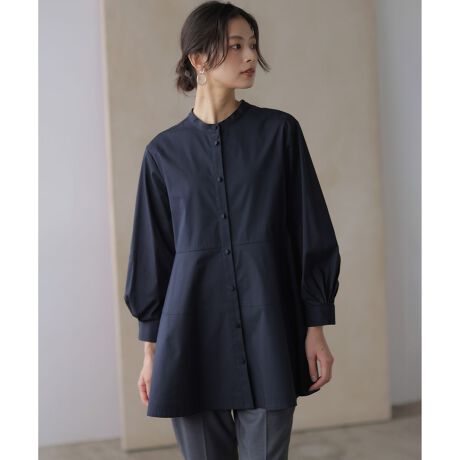 ■デザイン・前後2WAYで着られる仕様のふんわりとしたシルエットが大人可愛いティアードチュニックブラウス。・胸元の切り替え位置にこだわり、裾にかけて上品に広がるフレアデザインが体のラインを拾いづらいのも嬉しいポイント。・流れるような曲線の切り替えは女性らしさを演出してくれます。・端正なスタンドネックで少しだけハンサムな要素をプラスし、大人の程よい甘さに仕上げています。・1枚でサマになるので、シンプルなボトムスと合わせるだけで華やかにまとまります。