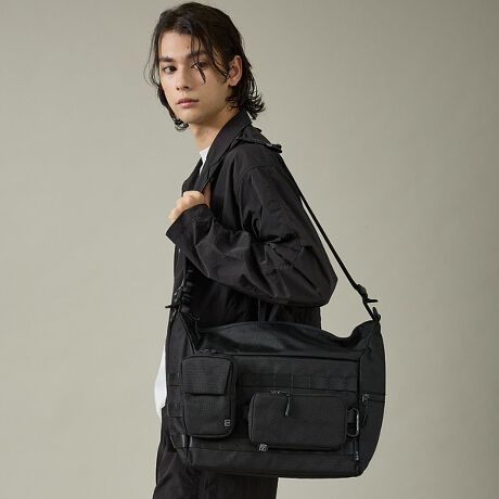 無駄を削ぎ落としたブラックボディに、ミリタリーテイストのギア感を落とし込んだテクニカルショルダーバッグ。