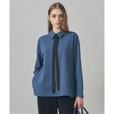 ■デザインシャープな衿と長めのカフスデザインがポイントのジャージートップスです。取り外し可能な細ボウタイつきで気分に合わせたスタイリングが楽しめます。シワも気にせずお手入れも簡単なので、寒い時期はニットINで日常使いにも最適です。ジャケットや羽織のインナーとして、お仕事はもちろん、セレモニーシーンなどの緊張感のある場面にもおすすめです。カラー展開はオフホワイト(002)ブラック(005)ブルーグレー(074)と、WEB限定のレース襟タイプのオフホワイト(102)ブラック(105)の4色展開です。※レース襟タイプのカフス内側部分もレース仕様となっております。そのままでも折り返しても着用可能です。