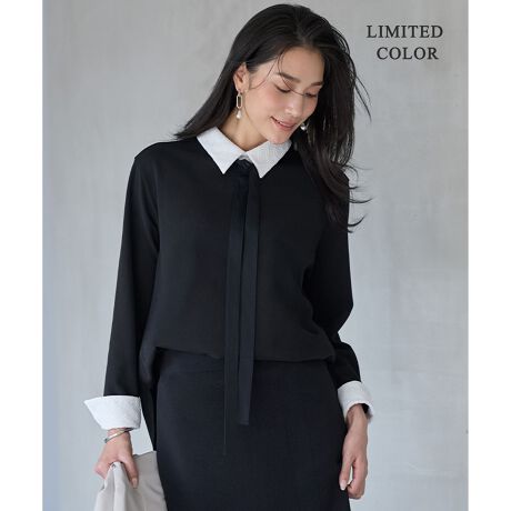 ■デザインシャープな衿と長めのカフスデザインがポイントのジャージートップスです。取り外し可能な細ボウタイつきで気分に合わせたスタイリングが楽しめます。シワも気にせずお手入れも簡単なので、寒い時期はニットINで日常使いにも最適です。ジャケットや羽織のインナーとして、お仕事はもちろん、セレモニーシーンなどの緊張感のある場面にもおすすめです。カラー展開はオフホワイト(002)ブラック(005)ブルーグレー(074)と、WEB限定のレース襟タイプのオフホワイト(102)ブラック(105)の4色展開です。※レース襟タイプのカフス内側部分もレース仕様となっております。そのままでも折り返しても着用可能です。