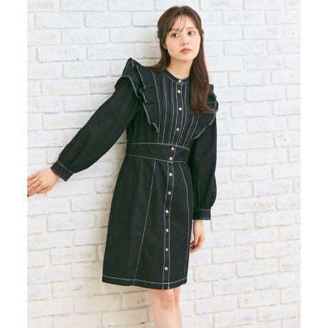 カジュアルなデニム素材にフリルデザインを加えたミニ丈のデニムワンピース。