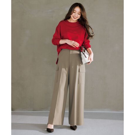 ■デザイン大人カジュアルなスタイリングに映える、きれいめカーゴパンツ。ミリタリーディテールを取り入れたデザインに、ウール調の上品な素材感とセンタープレスを組み合わせ、女性らしいきちんと感をプラスしました。後ろウエストはゴム仕様で、すっきり見えと快適な穿き心地を両立。さらに、サイドの釦でウエストサイズの調節も可能です。トップスを選ばず、ロングシーズン活躍する万能アイテムです。