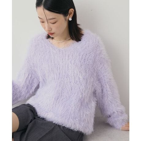 フワフワの毛足が特徴のニットをリブ仕様なしのVネックですっきりとした印象にアップデート。ややコンパクトな着丈とゆとりのある身幅のボックスシルエットが今年らしい一枚です。片畦編みで透けにくく、インナーのカラーを気にせず着られるのもポイント。細身のパンツやIラインのスカートと合わせてすっきりとしたスタイリングにするのがおすすめです。透け感[なし]