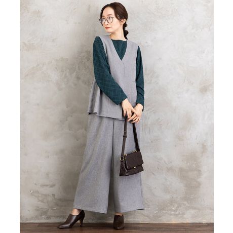 ツイスト調の表情ある生地を使用した、ジレとワイドパンツのセットアップ。