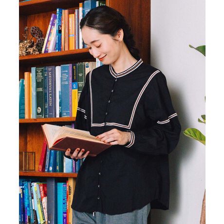 【ライン刺繍が引き立つ、バンドカラーブラウス】