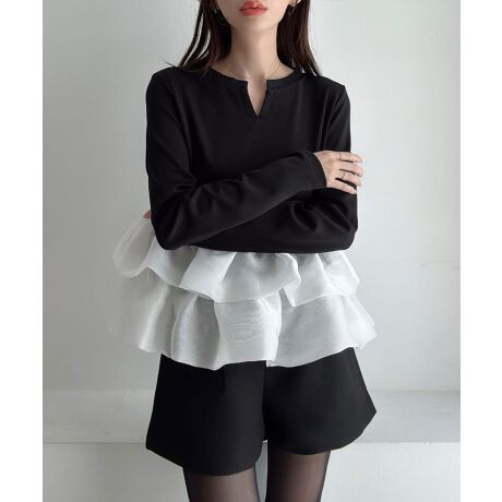 Meiru バルーンフリル長袖ペプラムトップス