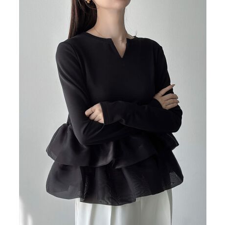 Meiru バルーンフリル長袖ペプラムトップス