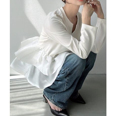 Meiru バルーンフリル長袖ペプラムトップス