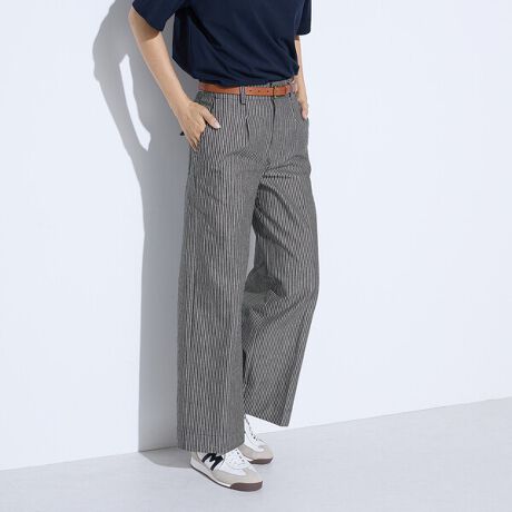 カジュアルなヒッコリーパンツをきれいめなスラックスパンツの仕様にすることで、大人っぽく仕上げています。