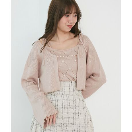 フロントに繊細なビジューチェーンをあしらったカーディガンと、透かし編みのダイヤ柄にビジューを散りばめたキャミソールがセットになったアイテム。