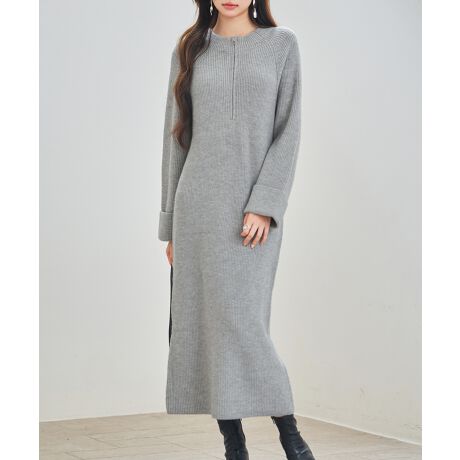一方にハーフファスナーがついたデザインのニットワンピース。前後2wayで着回しできます。ファスナーを開けてインナー見せもOK。