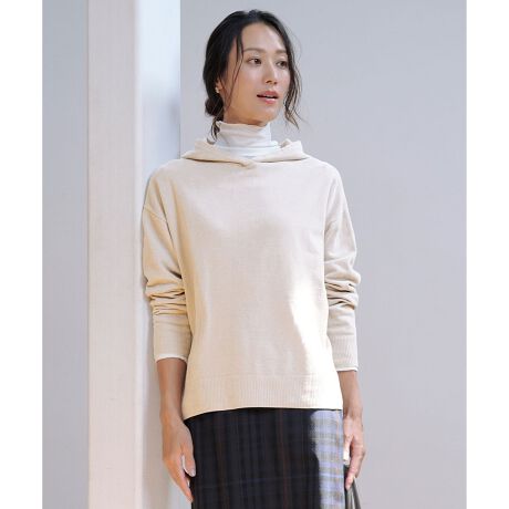 抜け感のある大人カジュアルスタイルに。やわらかなニットの風合いが心地よいフーデッドニット