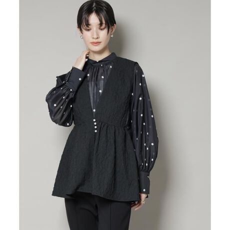 表面感のあるふくれジャガードが上品シックなペプラムジレ。コンパクトなトップにウエストで切り替えたペプラムフレアが可憐な装いを叶えるひと品。七五三などのセレモニーシーンや保護者会などのママ行事にもおすすめな一着です。