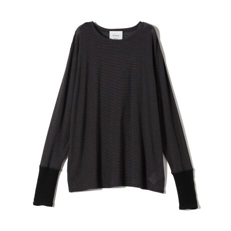 カシミア×シルク混で肌触りの良さとラグジュアリーな風合いで着心地の良いシアー感のある天竺素材。細めのボーダーピッチで取り入れやすく着回しのきくボーダ柄を使用。