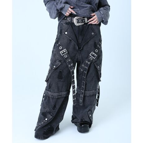 インパクト抜群のベルトと極太ワイドシルエットがポイントのストリート感溢れる一枚。