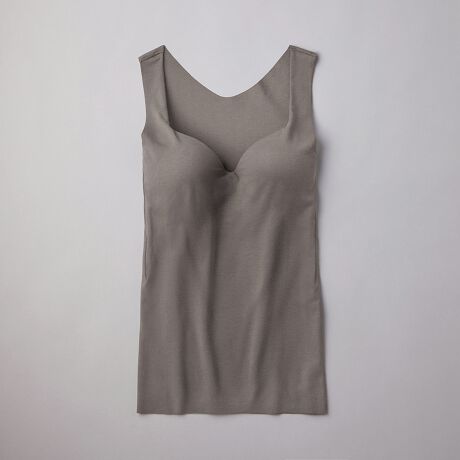 サイドに流れがちなバストラインを一体型のモールドカップがしっかり整え、すっきりとしたシルエットをつくります。生地端はきりっぱなしで低刺激。お肌にやさしく、下着のラインが外にひびきにくくなります。オーガニックコットン混のストレッチ素材が、体にやさしくフィットします。アンダーゴムを無くし、背中からバストにかけての締め付けを減らしました。