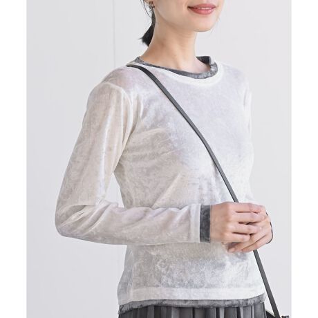 [型番:0200900274]☆2025/AW NEW☆光沢とシアーが一度に楽しめるベロアカットソーヴィンテージライクなベロアのような光沢が魅力のトップス。シンプルなデザインながらコーデが華やかになる1枚です。透け感も楽しめるメッシュ地。襟と裾、袖口を配色で切り替えたレイヤード風デザインが存在感を与えます。コーデにニュアンスを添えるおしゃれアイテム。裏地なし伸縮性あり薄手洗濯:手洗い可