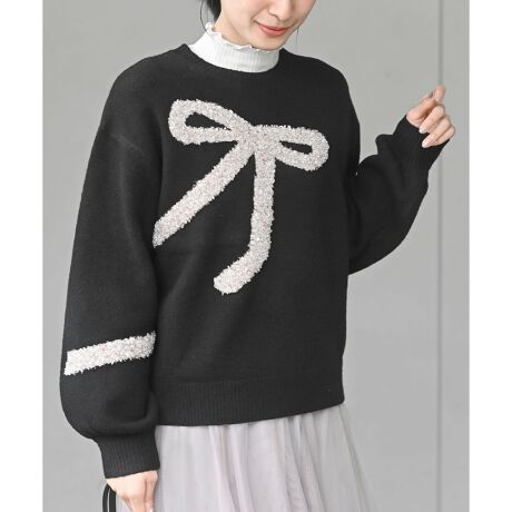 モールヤーンを編み込んだジャガードのリボンがアクセントを利かせるニットプルオーバー。