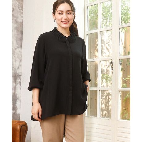 ◆上品で華やぐ、レース襟とパール調ボタン付きブラウス◆
