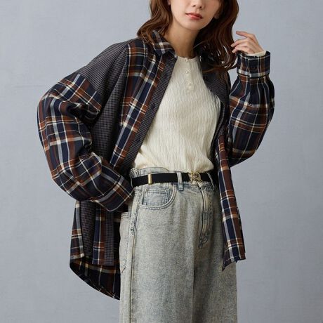 アシンメトリーな切り替えと2種類のチェックの組み合わせが一癖あるオーバーシャツが登場。
