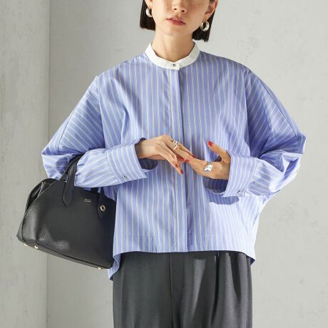 ドルマンスリーブのゆったりとしたシルエットですが、綿のハリ感を出しきちんと感を演出できるシャツにしました。