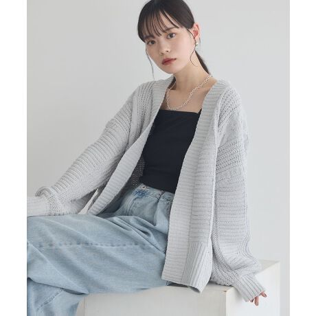 立体的なケーブル柄をミックスして編み立てたカーディガン。ふっくらとソフトな肌触りのモールヤーン素材で仕立て、さらりと1枚羽織るだけで着映え効果も抜群です。ゆとりのあるサイズ感で着心地良く、厚手のインナーを合わせてももたつきにくいのもポイント。いつものワンツースタイルに合わせるだけでこなれた着こなしが完成するおすすめのアイテムです。