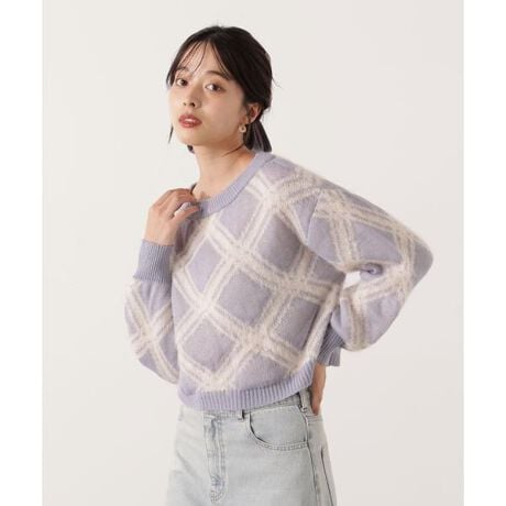 キラキラとした毛足のある糸を部分的に使い、フェミニンさを加えたチェック柄ニット。優しい配色のチェック柄がポイントです。短丈シルエットなのでスカートを合わせるとバランス良く決まります。