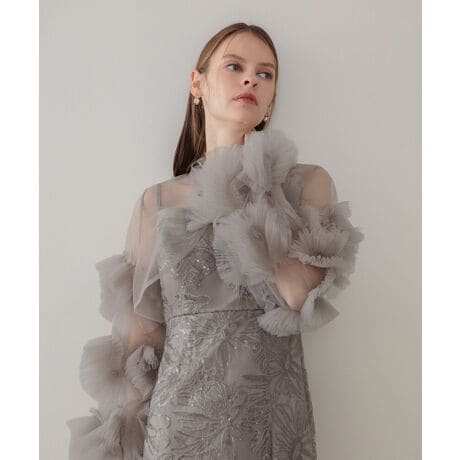 シアーなチュールと立体的なフリルスリーブを組み合わせた、華やかなIラインワンピースドレス