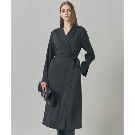 【洗える】ストレッチダブルサテン テーラーカラー ラップワンピース