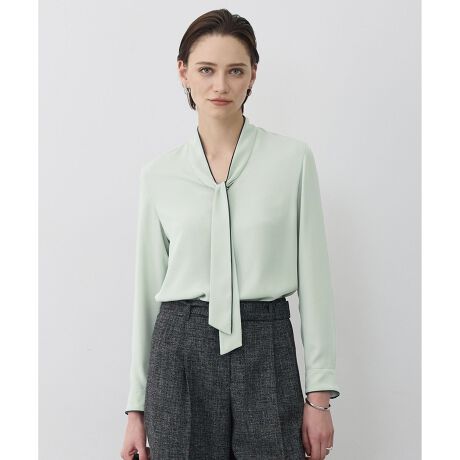 ■デザインバイカラーの配色トリミングを効かせたボウタイの長袖ブラウスです。単品でもジャケットのインナーとしてもスタイリングのポイントになるデザインに仕上げています。単品はもちろん、スーツやジャケットのインナーとして通勤やセレモニーシーンにも活躍します。※スモークグリーン(063)ネイビー(075)ブラックベース×ストライプチェーン柄 (205)は新色です。