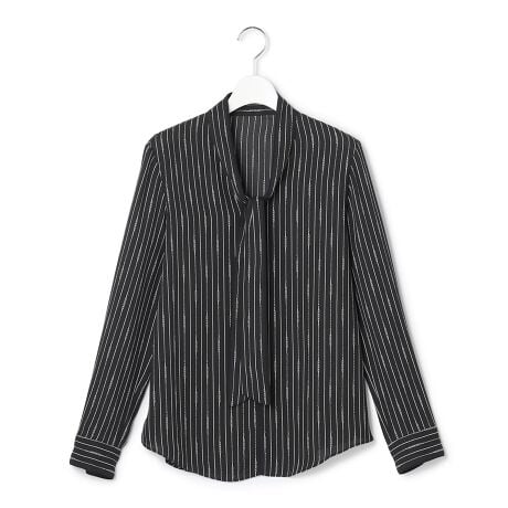 ■デザインバイカラーの配色トリミングを効かせたボウタイの長袖ブラウスです。単品でもジャケットのインナーとしてもスタイリングのポイントになるデザインに仕上げています。単品はもちろん、スーツやジャケットのインナーとして通勤やセレモニーシーンにも活躍します。※スモークグリーン(063)ネイビー(075)ブラックベース×ストライプチェーン柄 (205)は新色です。