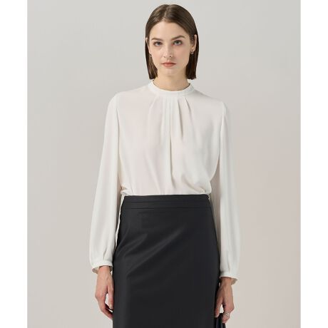 ■デザインハイネックのタックデザインがポイントで袖に膨らみ感を持たせた長袖ブラウスです。程よい袖のボリューム感はタックで表現し、甘くなりすぎないディテールにこだわっています.ジャケットINや一枚着としても着映えるのでセレモニーシーンや通勤などシーンレスに活躍します。
