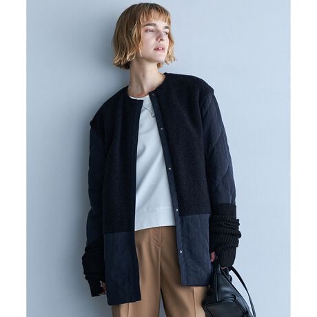 ■素材表面:ボア部分は、リサイクルウールを使用した軽さと膨らみ感のあるパイル素材を使用しています。タンブラー加工によりパイルの隙間に空気を含んでいるため、シープ調でふんわりとした素材感に仕上げています。別布には特殊な加工によるコンパクトなハリ感と、立体的なシボ感がポイントの雰囲気のあるヘビーツイル素材を使用しています。裏面:上品でしなやかな手触りが特徴のタフタ素材を使用しています。キルト加工はベーシックな柄ですが、やや大きめなダイヤ柄で、通常よりも立体感のある見え方に仕上げています。