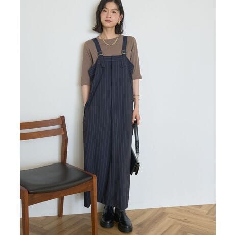 インナー次第で様々なコーディネートを楽しめるジャンパースカート。ゆったりとしたシルエットながら、ピンストライプ柄のスタイリッシュな雰囲気がすっきりとした印象に魅せてくれます。太すぎないストラップにメタルバックルが品良くアクセントをプラス。フロントジップ式で着脱しやすく、バックゴム仕様で着崩れしにくいのも嬉しいポイントです。透け感[なし]