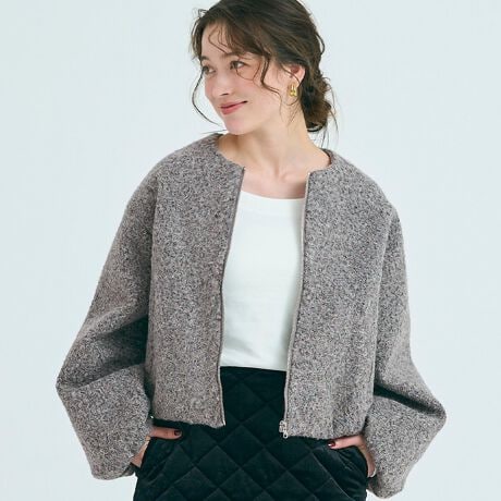 ノーカラーなのでストールやマフラーとも相性がよく、秋冬のアウターとして重宝すること間違いなしのアイテムです。