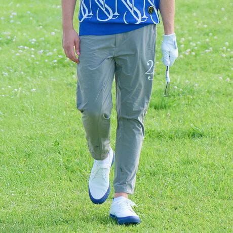 強度がありながらも軽やかで、控えめな光沢が上品な印象を与えるNissa Golfのウインドブレーカーパンツ。