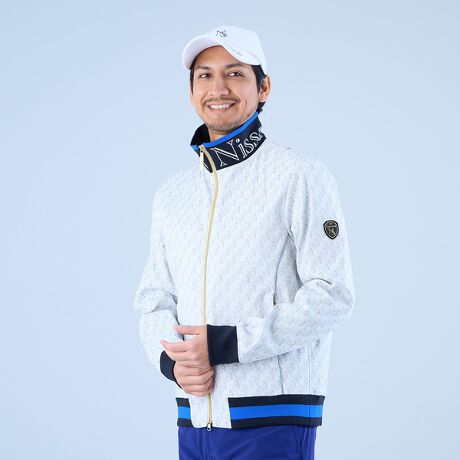 ラグジュアリーなデザインと機能性を兼ね備えた、Nissa Golfのモノグラムブルゾン。ブランドのアイコン「23」と「NS」をモチーフにしたモノグラム柄を、日本の伝統織物産地・米沢で繊細に織り上げ、奥行きと高級感のある仕上がりに。プリントでは表現できない上品なテクスチャーが、ゴルフシーンでもタウンユースでも洗練された印象を与えます。