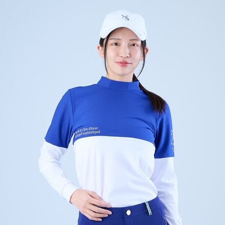 計算されたデザインが魅せる、配色切り替えモックネックは、スタイリッシュなさと機能性を兼ね備えた一着。吸湿速乾のストレッチ素材を使用し、動きやすさと快適な着心地を追求しました。計算されたカッティングが視覚的なメリハリを生み、シルエットを美しく演出。身体のラインを引き締めながらも、快適なフィット感を提供し、プレー中の動きを妨げません。