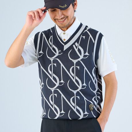 大胆なデザインと上質な快適性を兼ね備えたNissa Golfのモノグラムニットベスト。ブランドのアイデンティティを象徴する**「NS」モノグラム**を全面にあしらい、スポーティーでありながら洗練された雰囲気を演出します。