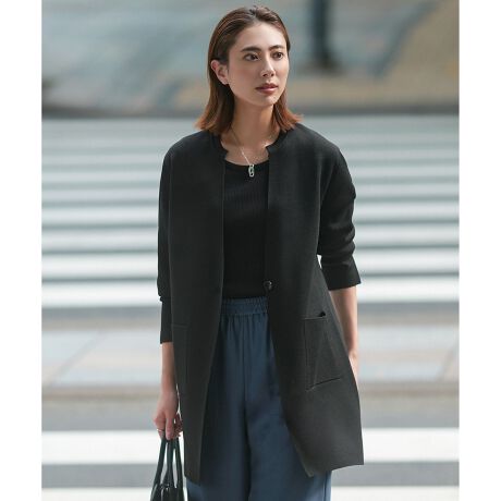 ■デザイン鎖骨映えするキーネックラインから、ストンと落ちる縦ラインが美しいロング羽織り。カーディガン以上コート未満の肉感と大きすぎないサイズ感で、薄手のカーディガンの上にも、コートの中にも着ていただける汎用性の高いアイテムです。パッチポケットもポイントになっており、エレガントな佇まいの中に実用性も兼ね備えた一枚に仕上げました。どんなボトムとも好相性なレングスで、様々なスタイリングに合わせられる万能な羽織りアイテムです。