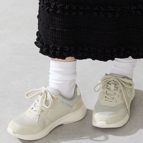 ワントーンでまとめたスエードとメッシュ素材のコンビネーションが、