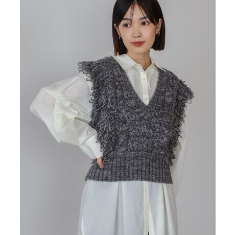 ループフリンジとケーブル編みが存在感を放つ、旬なデザインのニットベスト。Vネックと短丈シルエットで、ニットでもすっきり細見えするのが魅力です。ウエスト部分は長めのリブ仕様で自然にスタイルアップが叶い、ハイウエストのボトムやワンピースにも好相性。シャツやカットソーとレイヤードするだけで今っぽく仕上がります。