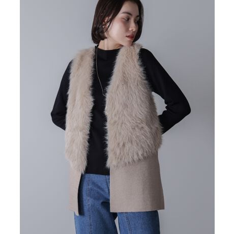 定番人気のファー×ニットのベストにミドル丈が登場!アウター感覚でサラリも着るのはもちろん、後ろ身頃がニットべースになっていてごわつかないので、コートのインにも着れるので、ロングシーズン着て頂ける優秀アイテムです。 ニットの後ろ身頃が伸縮性があるのが◎。ニット素材でもしっかりとした編地なので身体のラインを拾わずにすっきり着て頂けるのもオススメポイントです。