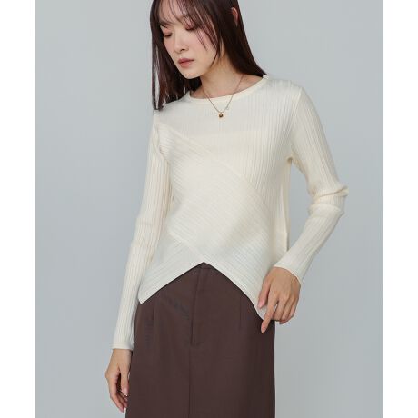 クロスされた裾デザインが印象的なリブニットトップス。シンプルな中にもデザイン性があり、一枚でコーデが決まる大人かわいいアイテムです。クロス部分は女性らしいシルエットを演出。コンパクトな丈感でスタイルアップも叶い、オフィスにも休日にも活躍する万能トップスです。