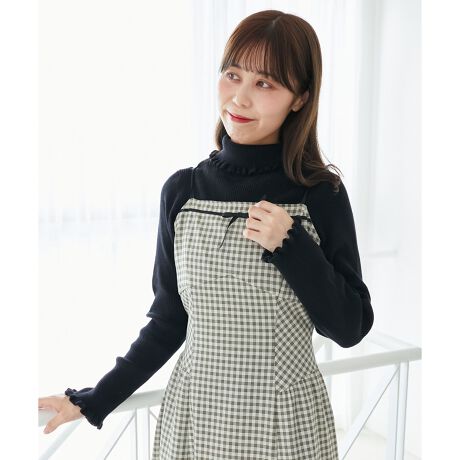 バイカラーラインのフリル部分がアクセントのタートルニット。