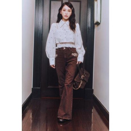 【オリジナルフラワー刺繍がロマンティックなブーツカットパンツが登場】■ポイントオリジナルのフラワー刺繍をあしらったブーツカットのデニム風パンツ。ビンテージ風な加工にロマンティックなフラワー刺繍が目を引く1着です。センターフロントにも加工を加え視覚的美脚効果に拘りました。■ディテール膝位置にタックを加えることで膝下を長く見せてくれます。ポケット周り(腰回り)に刺繍があるので視線が上にいきスタイルアップ効果も◎■スタイリングシルエットに拘ったパンツなので様々なトップスとの相性がばっちり。コンパクトなニットトップスと足元にミュールなどのレディーな着こなしがおすすめです。■生地透け感:なし裏 地:なし伸縮性:なし光沢感:なし厚 さ:なし■商品のお気に入り登録お気に入りアイテムの再入荷・在庫1点などの通知を受け取ることができます。[注意事項]※画像の商品はサンプルです。実際の商品と仕様、加工が若干異なる場合があります。※画像の商品は光の照射や角度、お使いのモニター環境により、実物と色味が異なる場合がございます。※着用、お取り扱いの際は、アテンションタグをご確認ください。